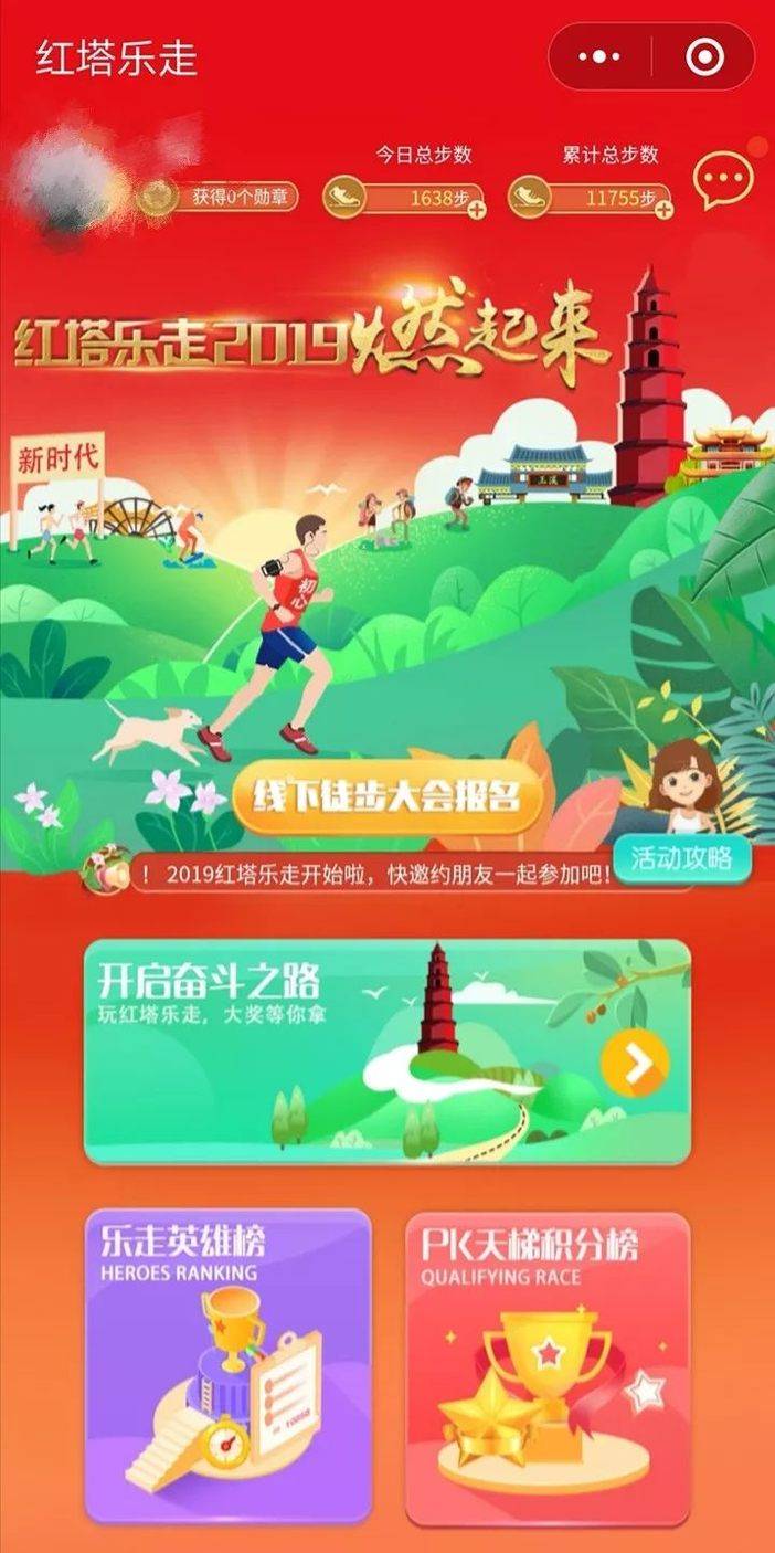 开启“红塔乐走”小程序,每天6000步,点亮当日任务,完成任务即可获得相应数量的勋章碎片,每阶段集齐200个碎片即可合成一枚阶段勋章,凭勋章可进入“奖品兑换区”兑换该阶段奖品一份,而累计步数越多,能兑换的奖品价值越高。