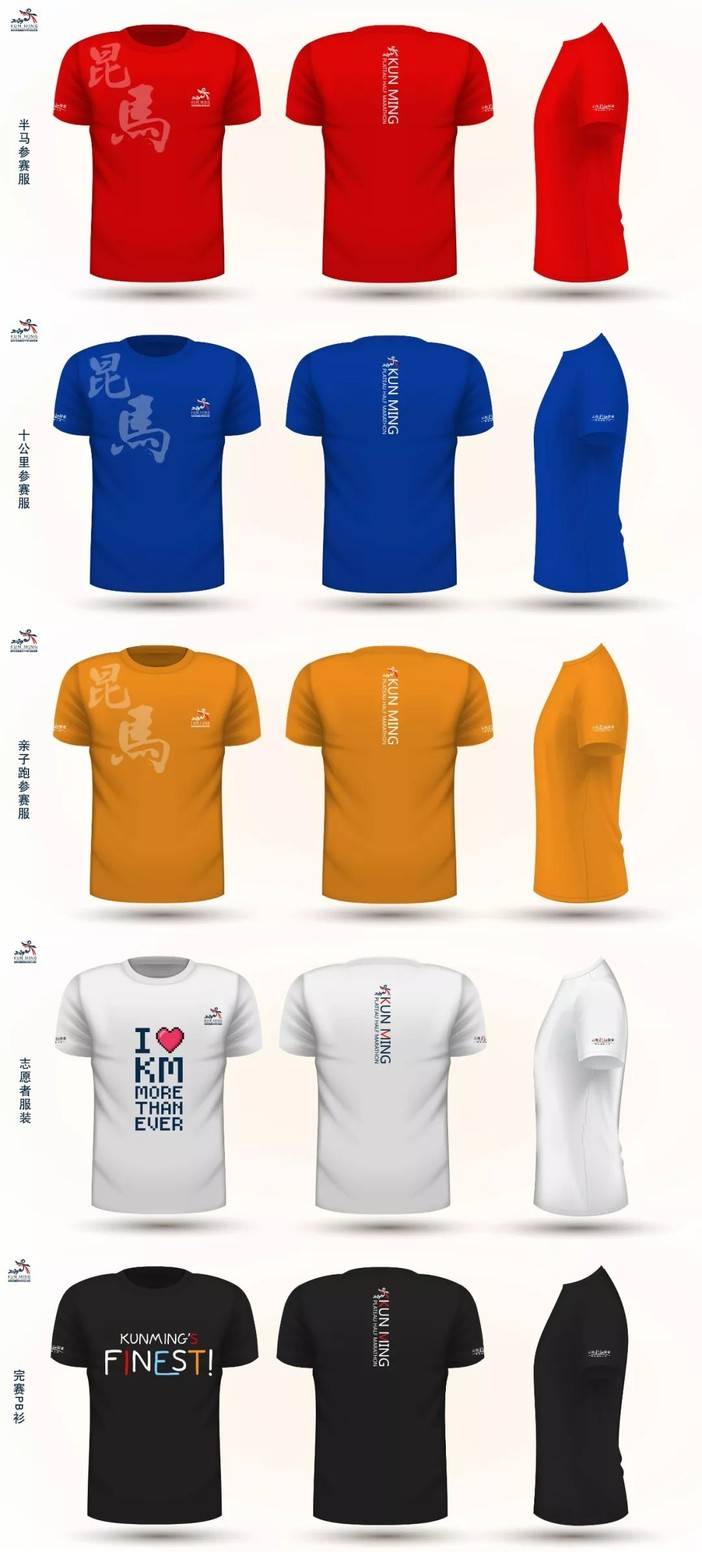 半程马拉松、十公里乐跑、亲子跑组别参赛服分别采用中国红、昆明蓝和太阳橙为主色,配以“昆马”暗纹文字。同时,为创造“最好成绩”的选手提供了象征荣誉的PB衫,为志愿者提供了“I love KM”文化衫。