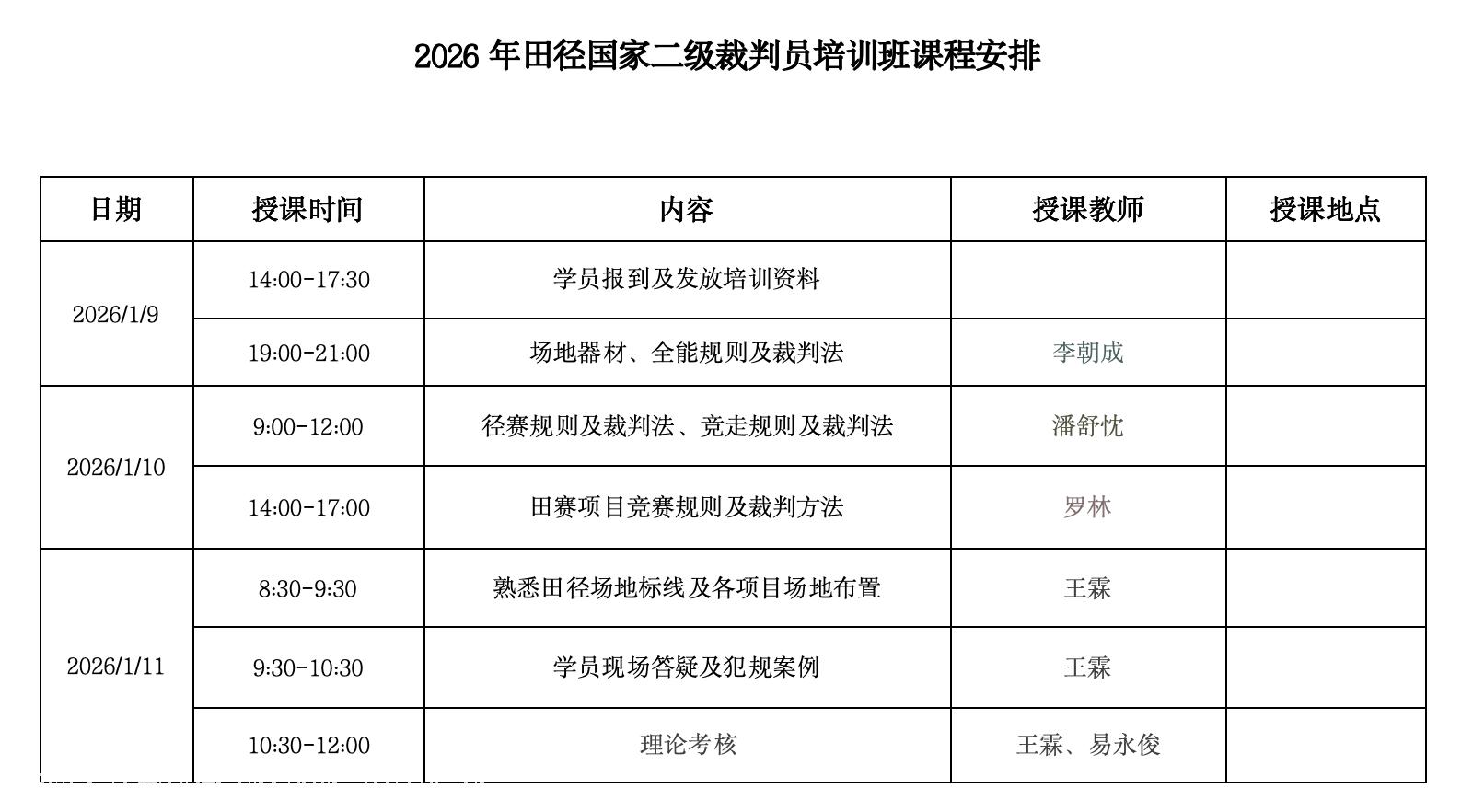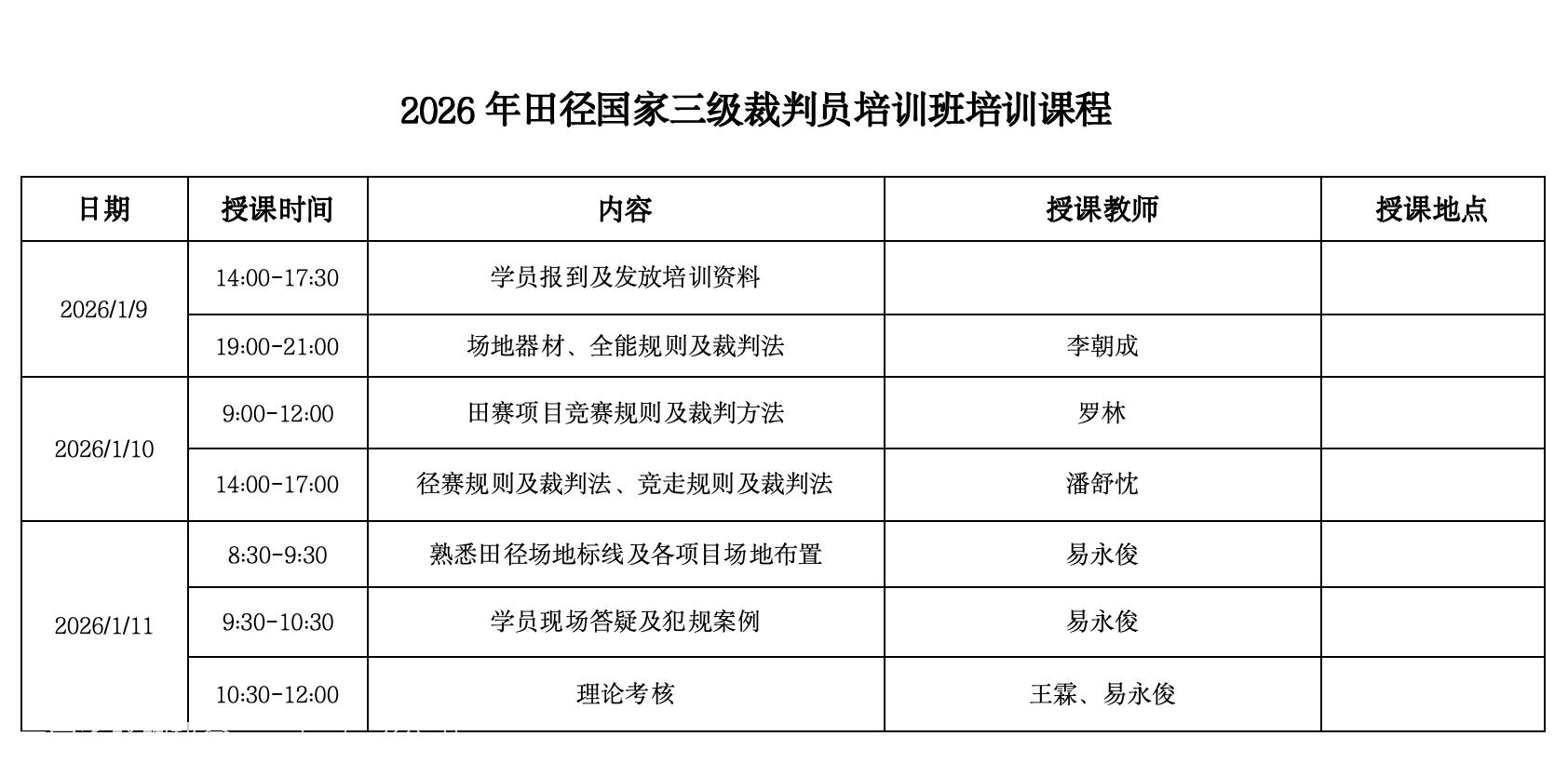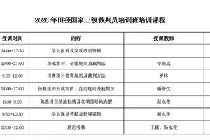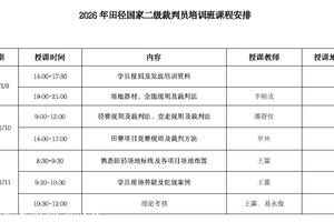 为推动云南省竞技体育工作的深入开展,适应云南省田径竞赛发展的需要,培养充实田径裁判员队伍,进一步加强我省田径项目裁判员队伍建设,为我省田径竞赛迅速发展做好基础保障工作,根据《田径竞赛裁判员管理办法实施细则》,经云南省体育局批准,云南省路跑协会定于2026年1月,同时举办三级、二级田径裁判员培训班 ,现将有关事项通知如下: